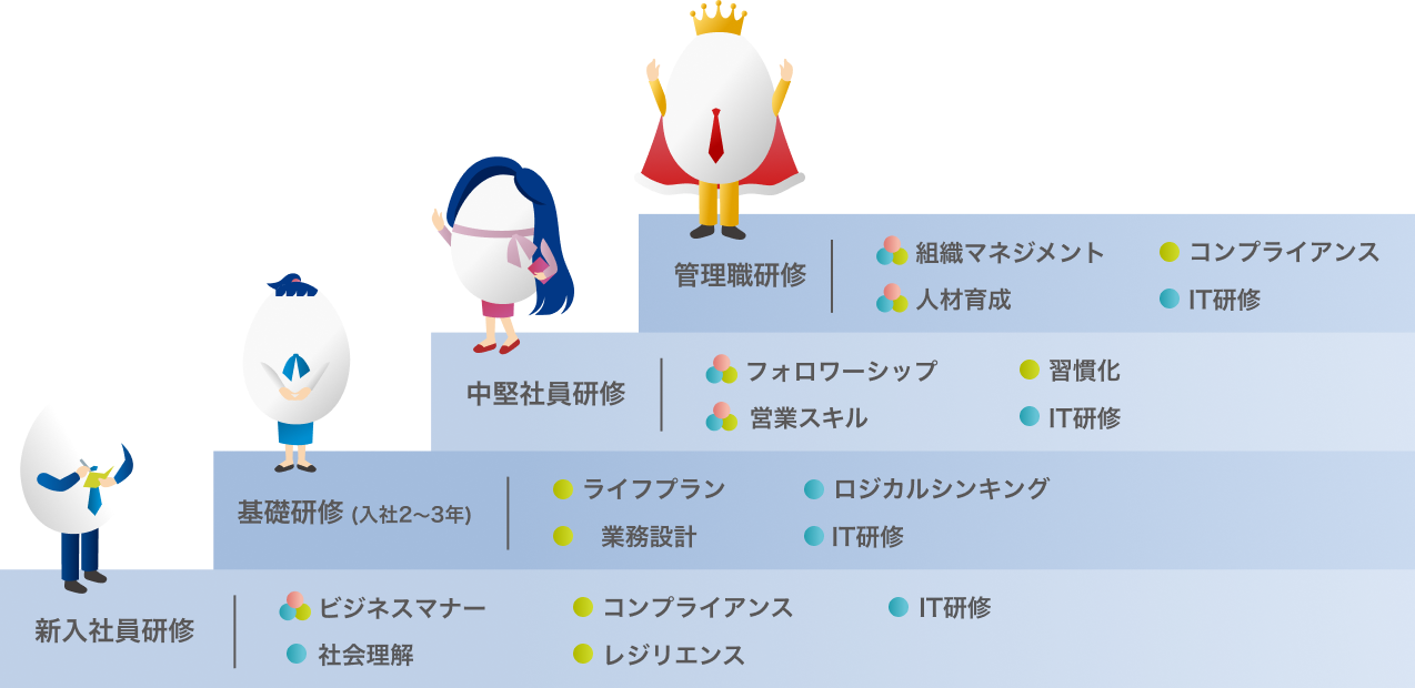 階層別研修と目的別研修を通じて、社員ひとりひとりの成長をしっかりとサポートします。